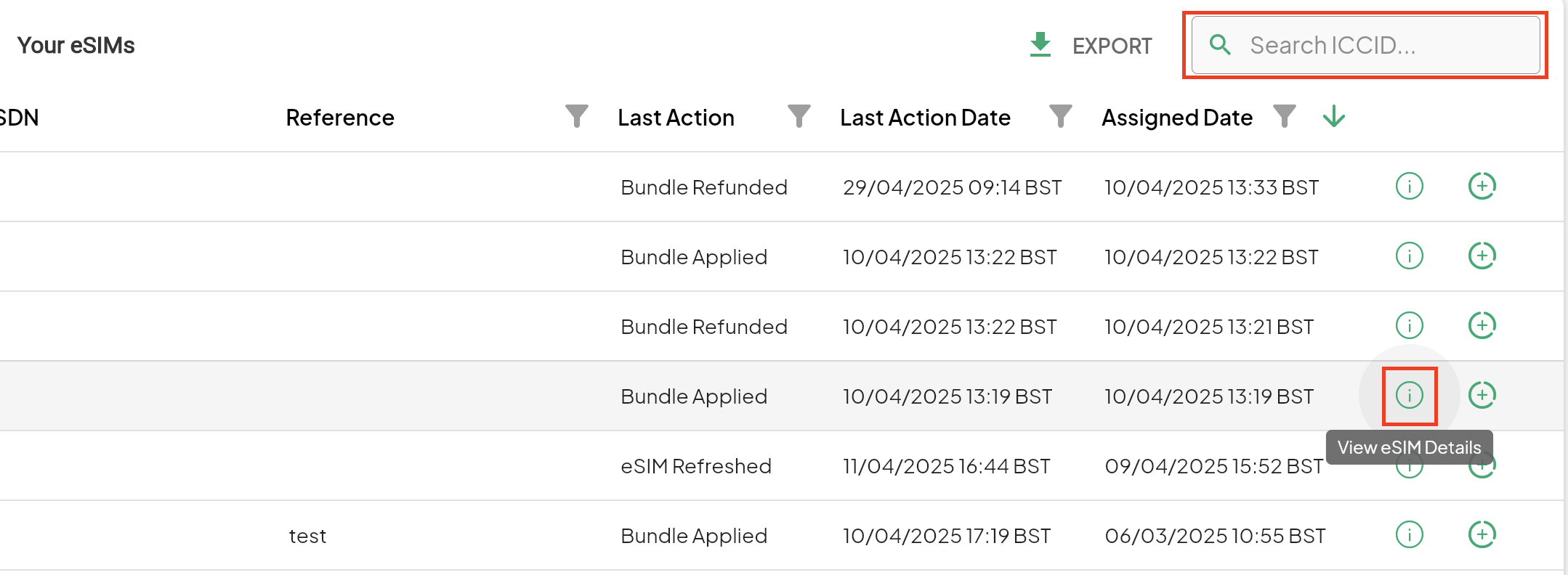 Note: If you know the ICCID of the eSIM then you can type this into the search box to filter out the remaining eSIMs.