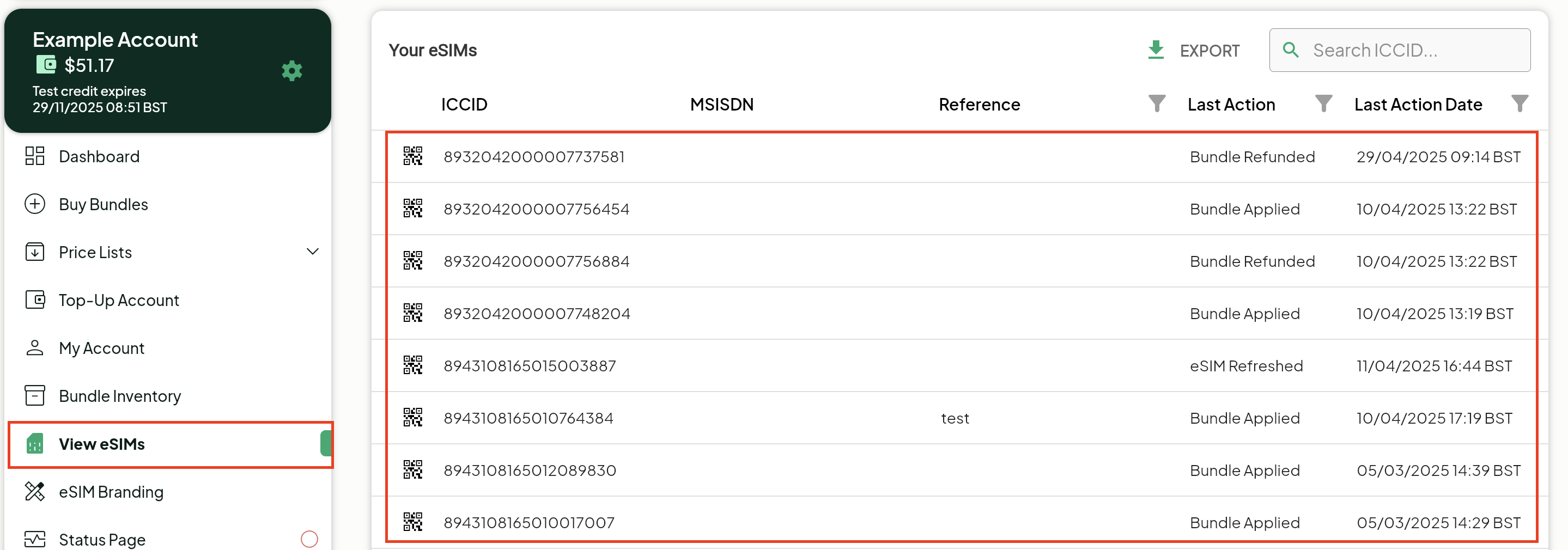 2. Click View eSIMs - all ICCID's are now displayed in the SIM Management screen.