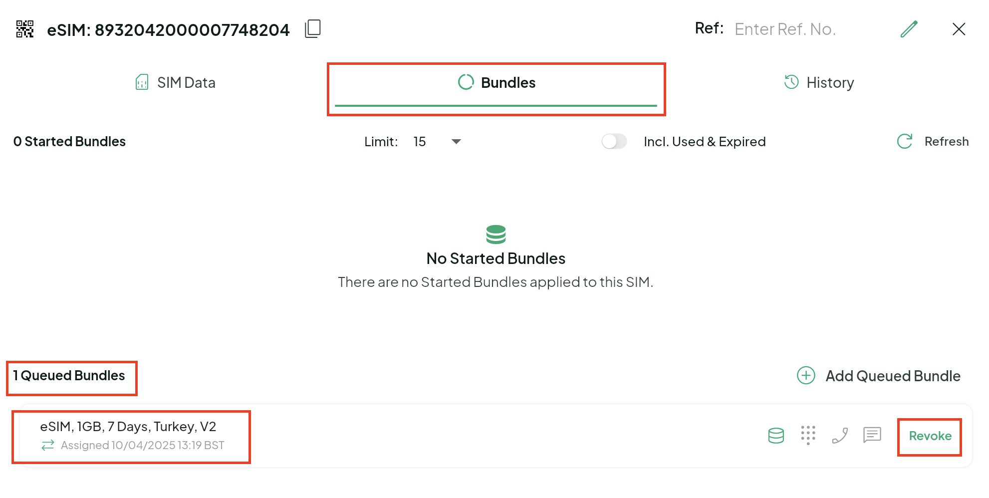 4. Click Bundles. You can now see the queued bundles on the eSIM. In this example we will remove the 1GB, 7 day, Turkey bundle. Click Revoke.
