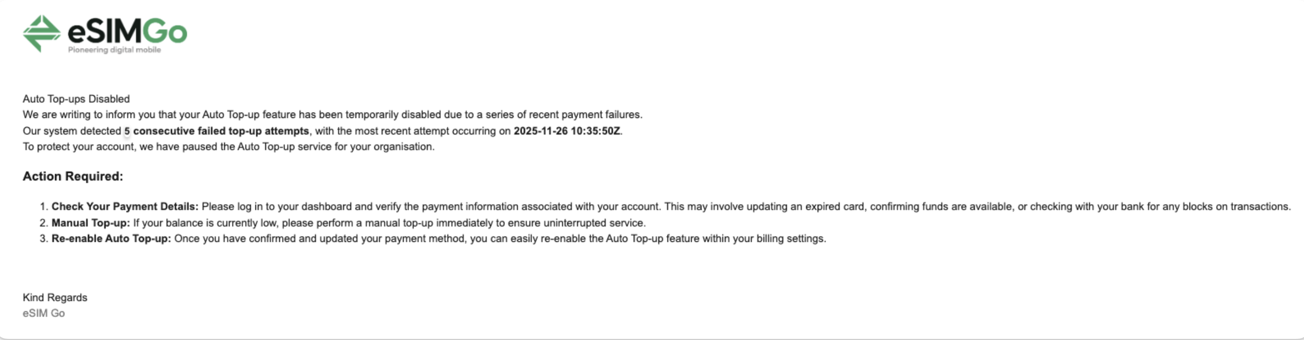 If more than 5 auto top-ups attempts fail in a row, the 'auto top-up' feature will be disabled for your organisation. You will be notified via email if this occurs. See example email below: